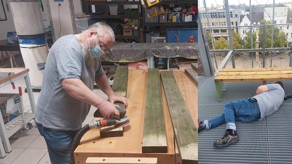 Mit großem Einsatz begann Herr Becker damit, die Holzbohlen der Bänke sorgfältig zu demontieren. Anschließend brachte er diese in die offene Werkstatt „Supermarkt der Ideen“, wo er die Oberflächen gründlich abschliff und mit einer schützenden Holzlasur behandelte. Durch diese Bearbeitung konnte nicht nur die Langlebigkeit des Materials verbessert werden, sondern auch die natürliche Maserung des Holzes wieder hervortreten.